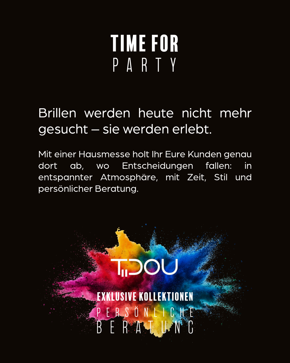 Für ein exklusives Event wird Euer Geschäft zum Treffpunkt für Stil, Design und individuelle Beratung. Wir senden Euch die aktuelle Kollektion von TiDOU zu und Ihr ermöglicht Euren Kunden einen Abend voller Brillenmode zum Anfassen.